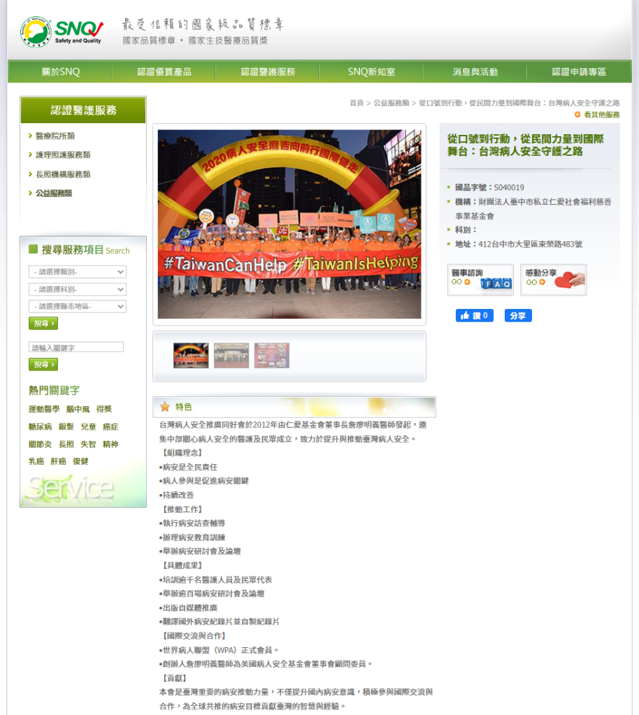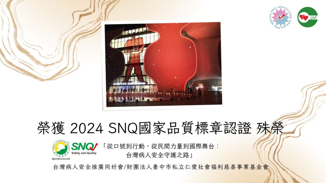 ~賀~台灣病人安全推廣同好會/財團法人臺中市私立仁愛社會福利慈善事業基金會【從口號到行動,從民間力量到國際舞台:台灣病人安全守護之路】榮獲2024 SNQ國家品質標章公益服務認證! 相關連結 病人安全推廣-說到底、問到底、傳到底