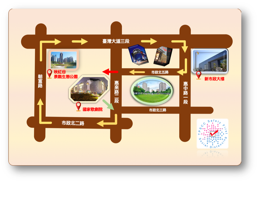 臺中國家歌劇院~右轉市政北二路~右轉朝富路~秋紅谷景觀生態公園~右轉臺灣大道三段~右轉惠中路一段~右轉市政北五路~臺中國家歌劇院(全程約3KM)